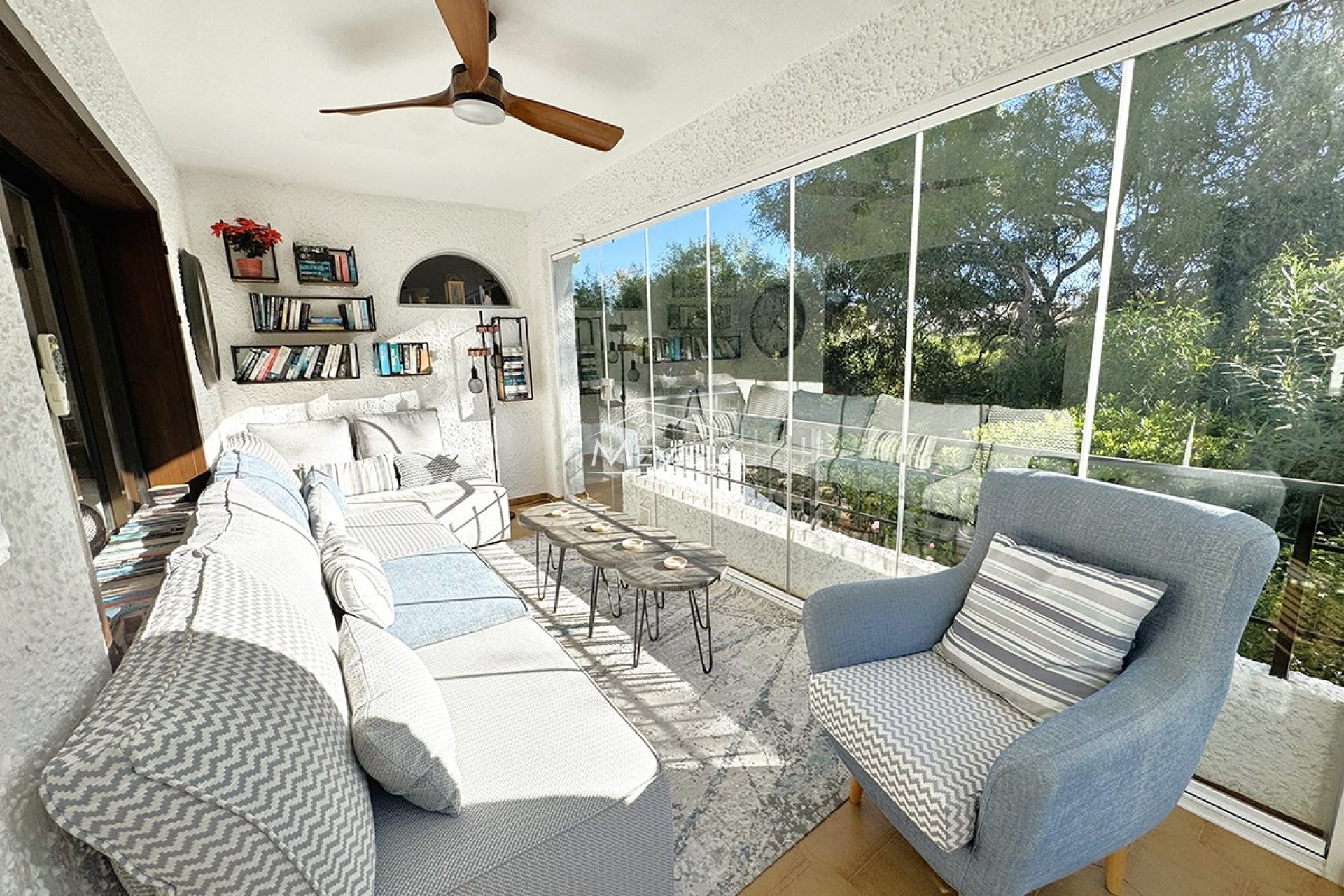 The main floor has a large separate kitchen, a fully equipped bathroom and a spacious and bright living room that opens onto a charming glazed terrace. Upstairs there are three double bedrooms and a second bathroom, as well as a private terrace with unobstructed views of the communal areas and the large communal swimming pool.