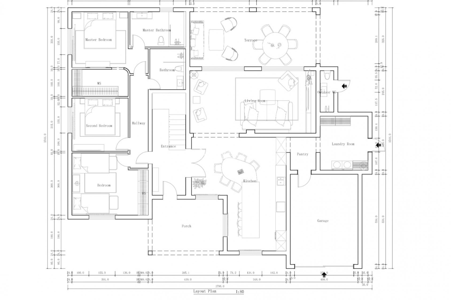 - Open-concept kitchen with dining and living area, seamlessly connecting to a covered terrace with dining and lounge areas